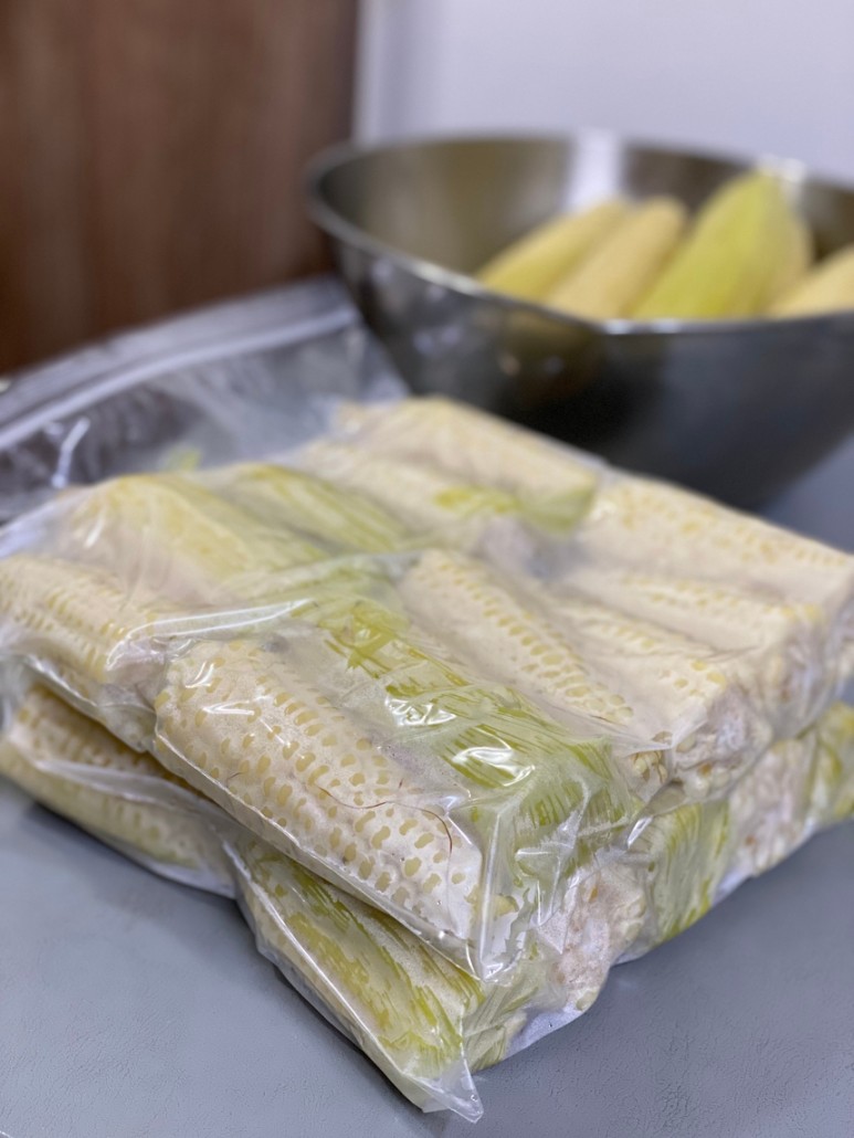 4. 삶아진 옥수수는 물에서 건져 어느 정도 식힌 후 비닐로 밀봉해서 냉동해 주세요. 드실 때 찜기에 쪄 드시거나 잠시 다시 삶아 드시면 되는데요, 저는 김오른 찜기에 10분 정도 쪄서 먹는 것이 가장 맛있었어요.