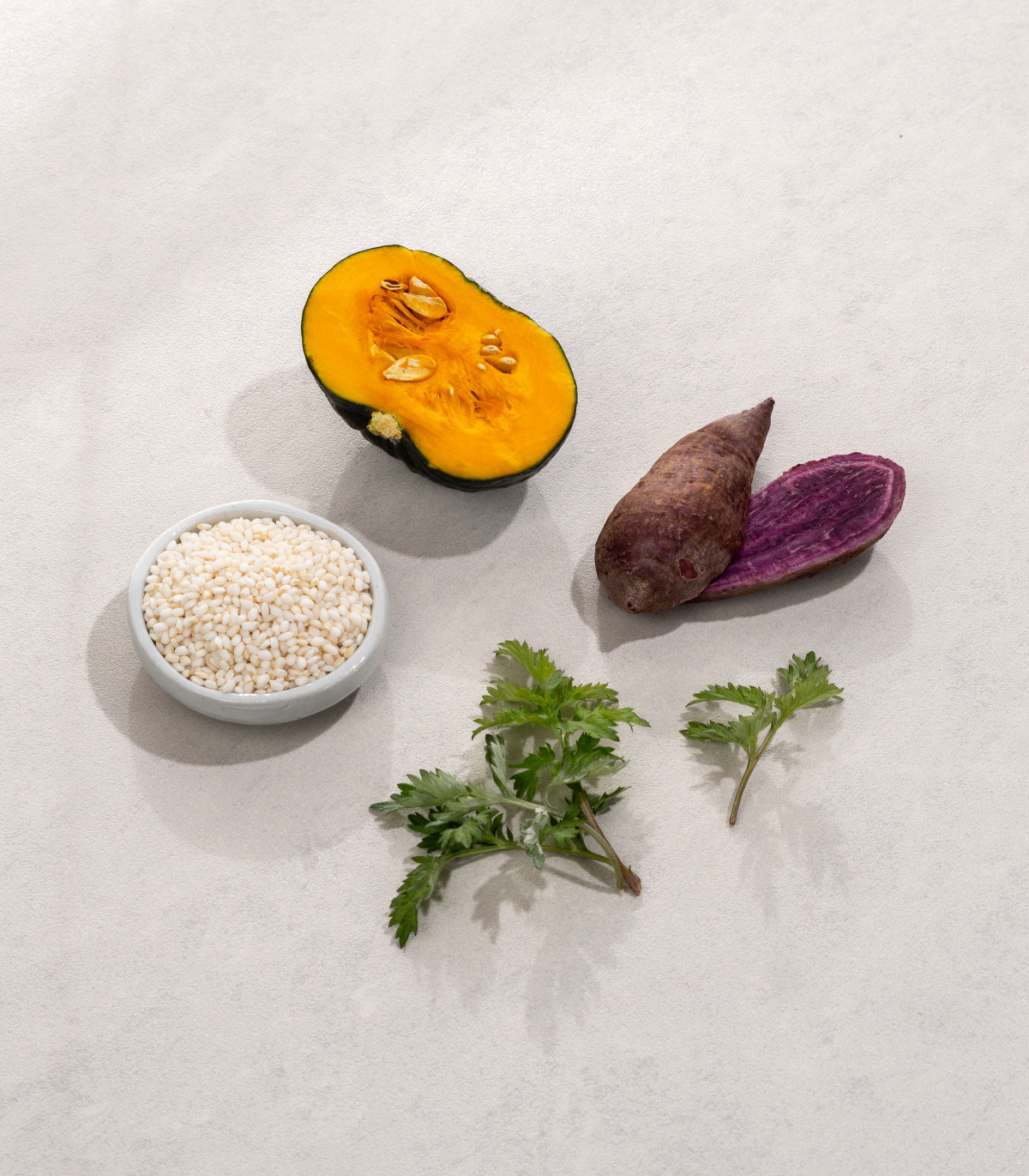 · 반죽 : 백미찹쌀(국산, 유기농) 84%, 자색고구마(국산) 5%, 단호박(국산, 유기농) 5%, 냉동쑥(국산) 5%, 천일염(국산)1%