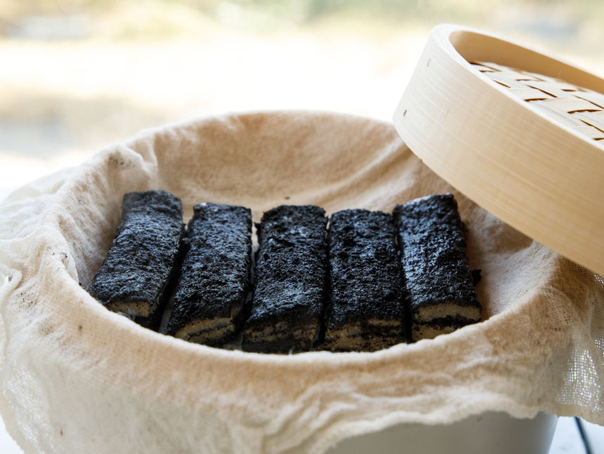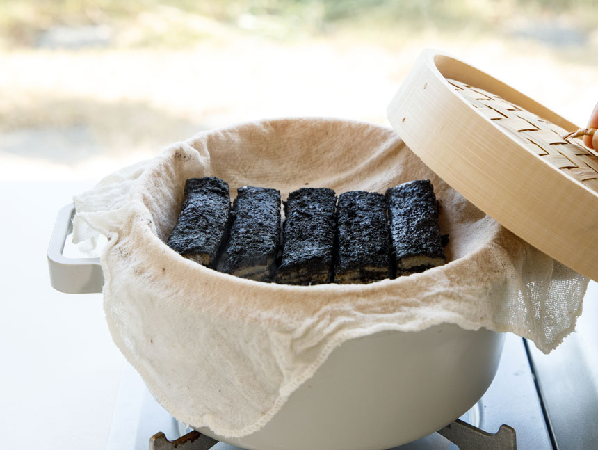 4. 찰떡 전용 찜기에 흑임자 고물과 쌀가루를 켜켜이 깔아 한 시간 이상 쪄줍니다.
