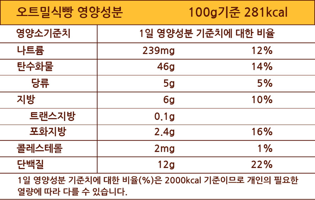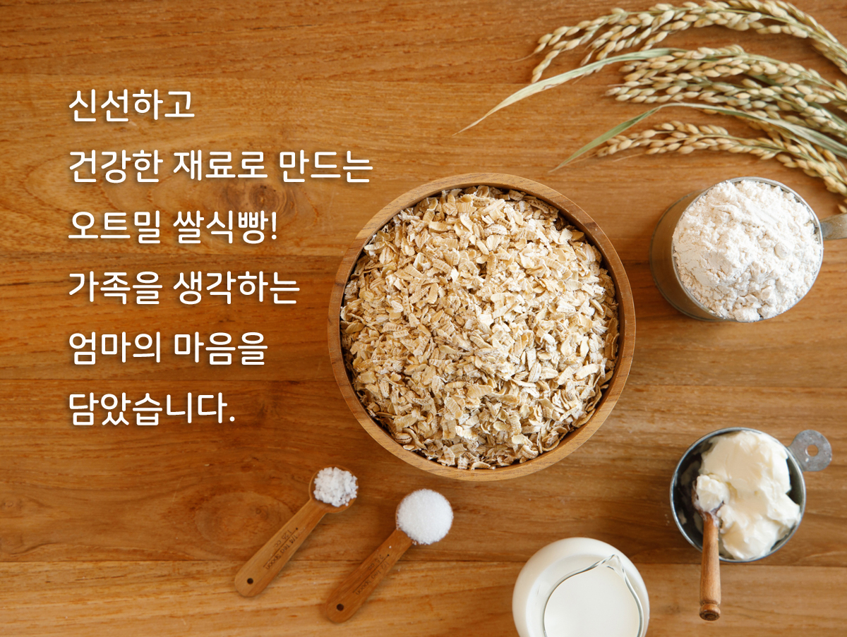 강력쌀가루(국산) 61.3%{쌀가루(국산)75.6%,글루텐(미국,호주)텍스트린(변성전분,백설탕,포도당)}, 오트밀[귀리100% (국산)]20.2%, 우유, 가공버터, 설탕, 생이스트, 정제염