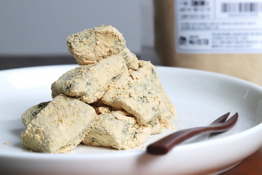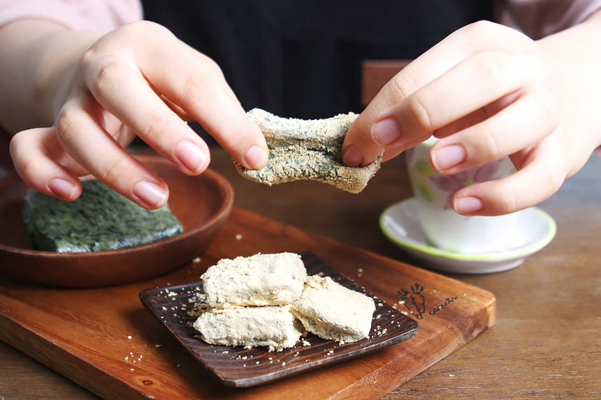 ▶ 손에 붙어 드시기 불편하시면 콩가루를 묻혀 드셔도 좋아요.