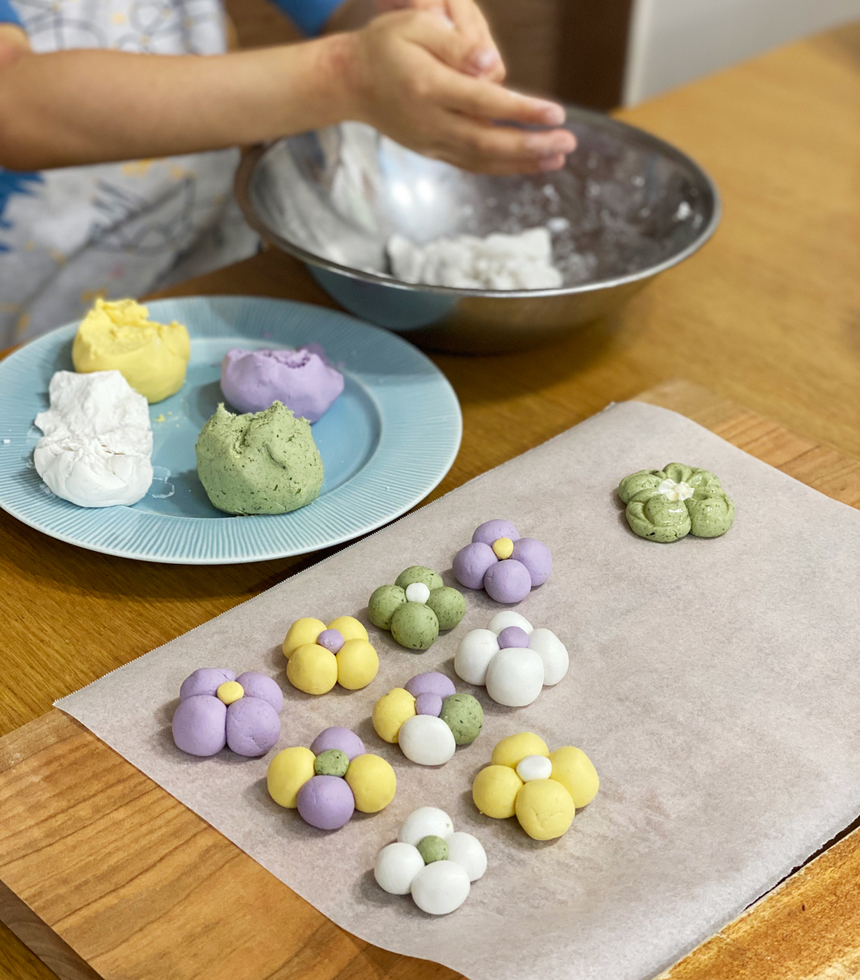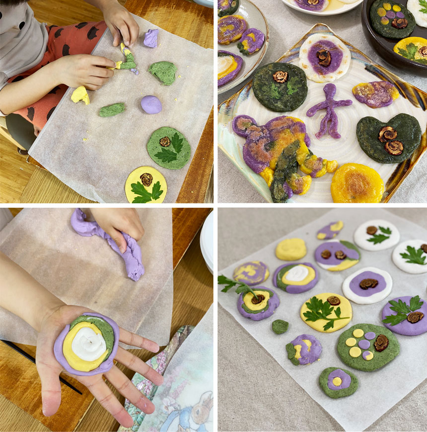 다양한 색의 반죽을 이용해서 모양을 만드셔도 좋아요.