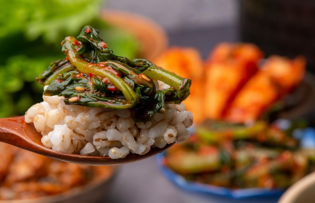 -한 주먹 넣으셔도 좋고, 보리와 같은 양을 넣어주셔도 좋아요. - 잘 지은 꽁보리밥에 강된장, 열무김치, 콩나물, 상추 등을 넣고 비벼서 맛있게 드세요.