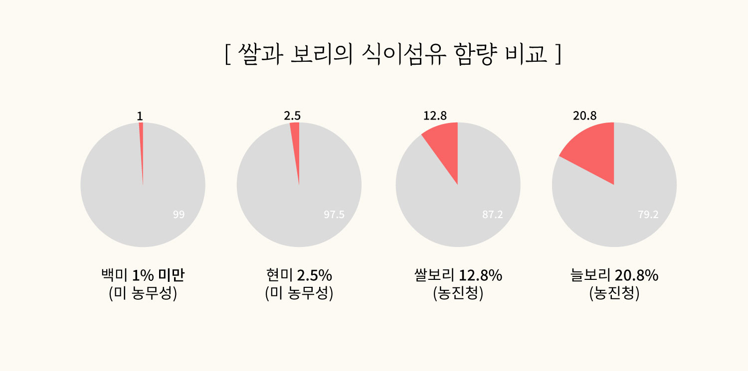 쌀보리는 식이섬유 함량이 10% , 늘보리의 식이섬유 함량은 20%입니다.